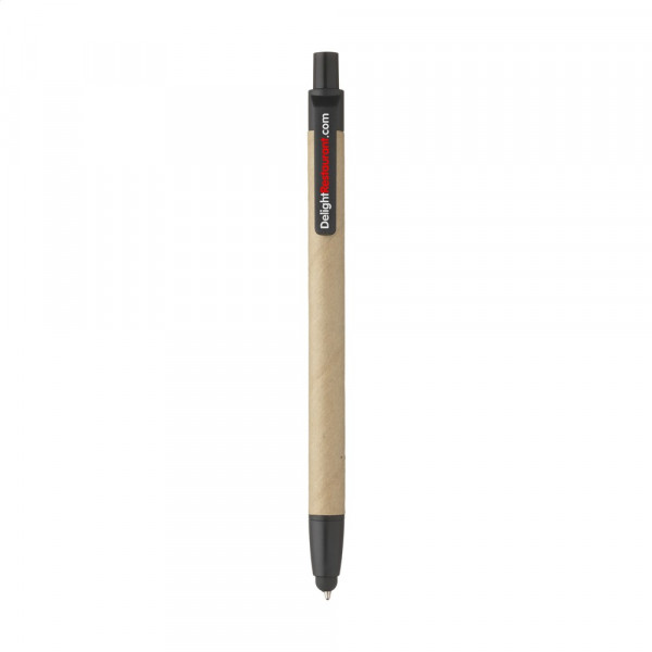 Blauwschrijvende balpen met houder van gerecycled karton, rubberen pointer voor het bedienen van touchscreens en kunststof accenten.