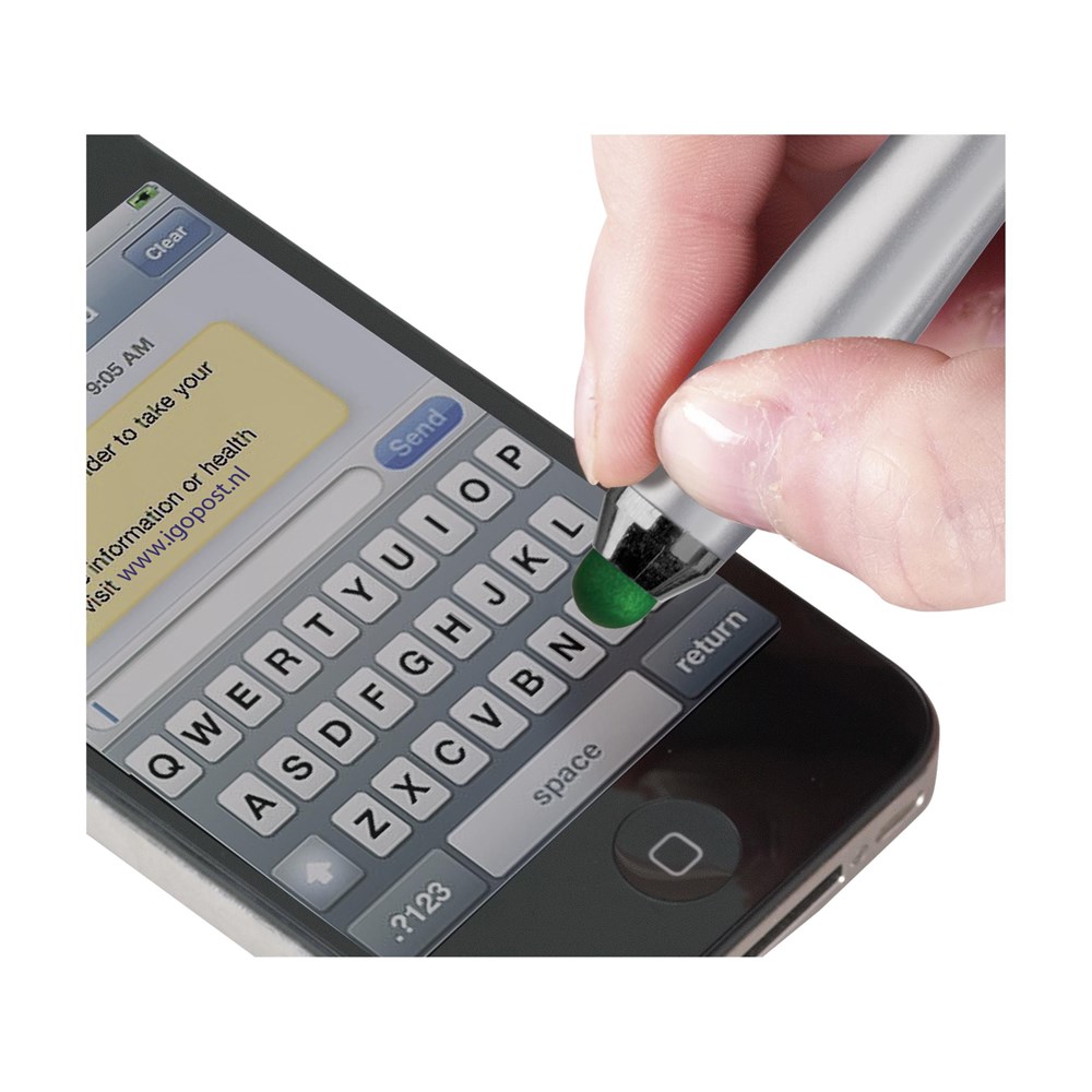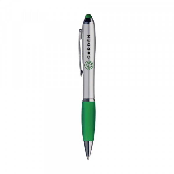 Blauwschrijvende balpen met gekleurde, rubberen top/pointer voor het bedienen van touchscreens (zoals iPhone/iPad). Voorzien van hoogglans accenten, gekleurd, gripvast voorstuk, uitsparing in metalen clip en draaikliksysteem.