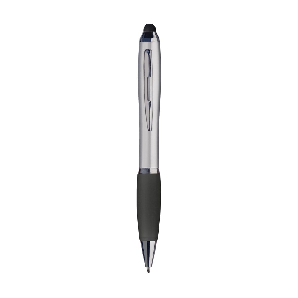 Blauwschrijvende balpen met gekleurde, rubberen top/pointer voor het bedienen van touchscreens (zoals iPhone/iPad). Voorzien van hoogglans accenten, gekleurd, gripvast voorstuk, uitsparing in metalen clip en draaikliksysteem.