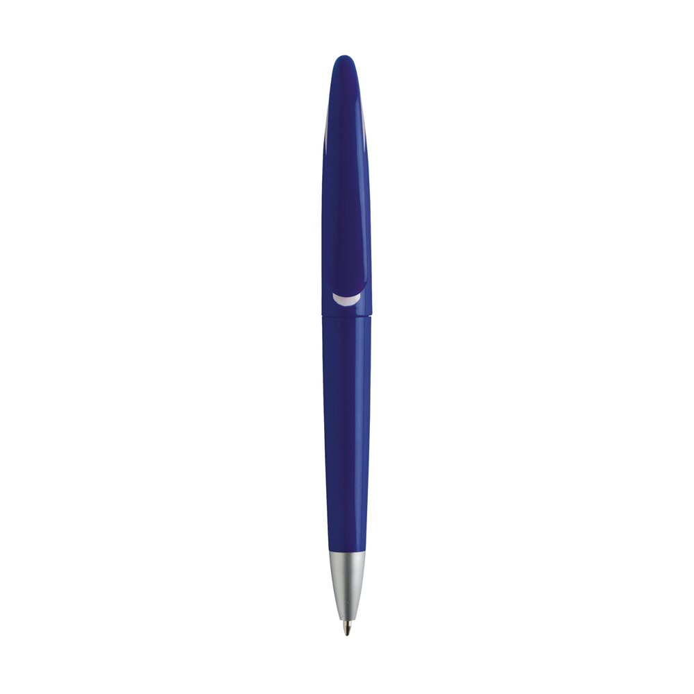 Blauwschrijvende balpen met fraai gebogen clip met wit-accent en draaikliksysteem.