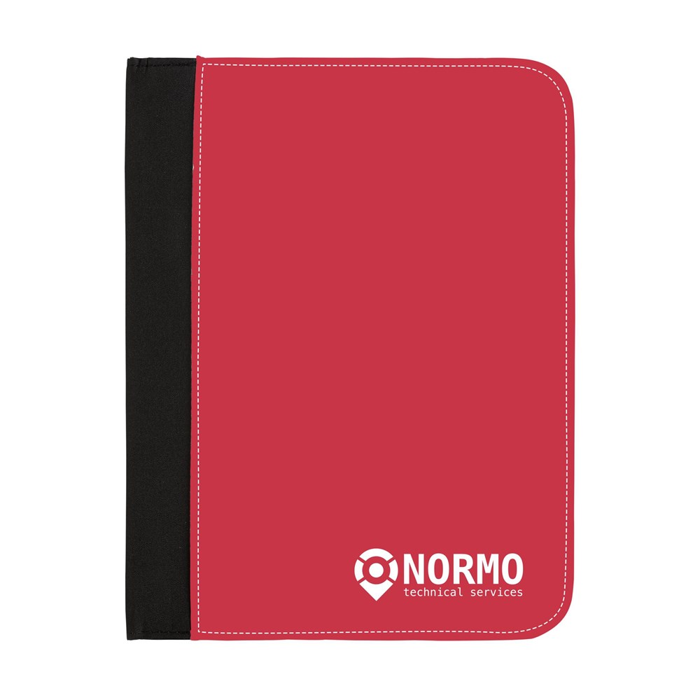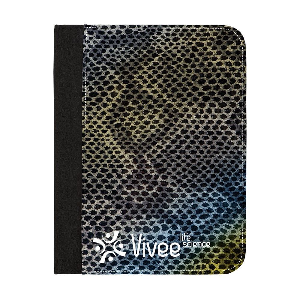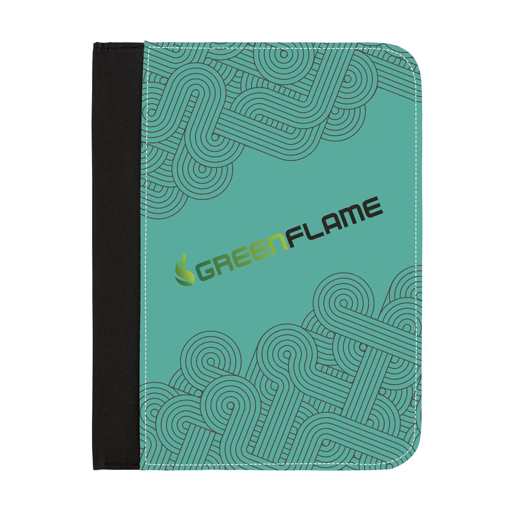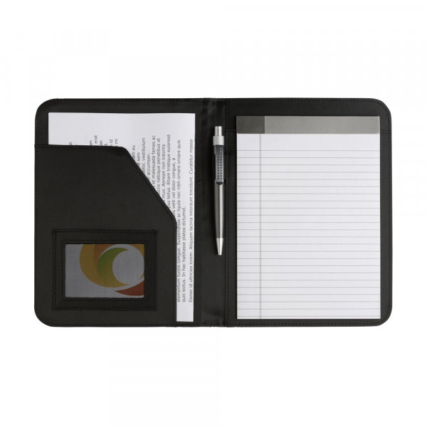 Schrijfmap in A5-formaat. Van stevig, gewatteerd microfiber. Met 2 insteekvakken, elastische penhouder, gelinieerde schrijfblok en balpen. Deze schrijfmappen leveren wij precies zoals u wilt: in iedere gewenste kleur, met een uniek ontworpen print of eigen design. Zelfs haarscherpe foto’s of een combinatie van alle bovenstaande opties behoren tot de mogelijkheden.