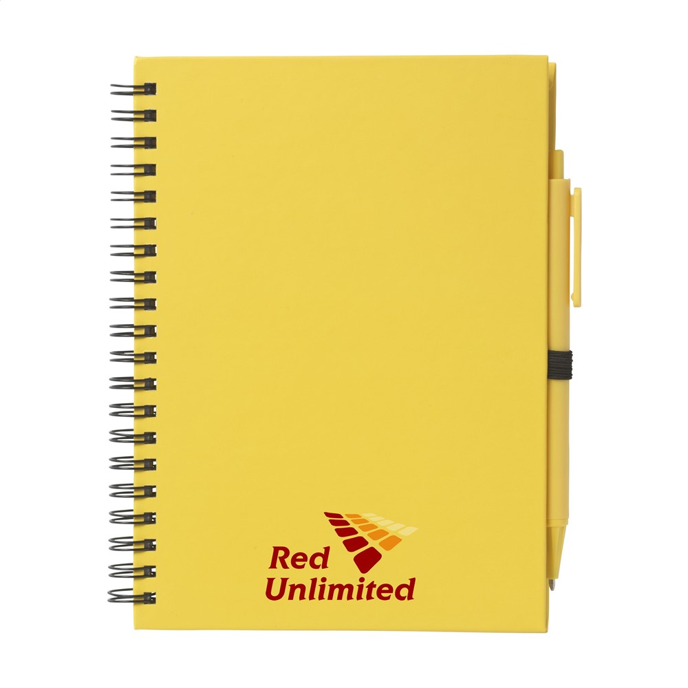 Notitieboekje met ca. 70 vel wit gelinieerd papier en kartonnen, gekleurde omslag. Gebonden in een sterke, metalen wire-o-binding. Incl. bijpassende, blauwschrijvende balpen.