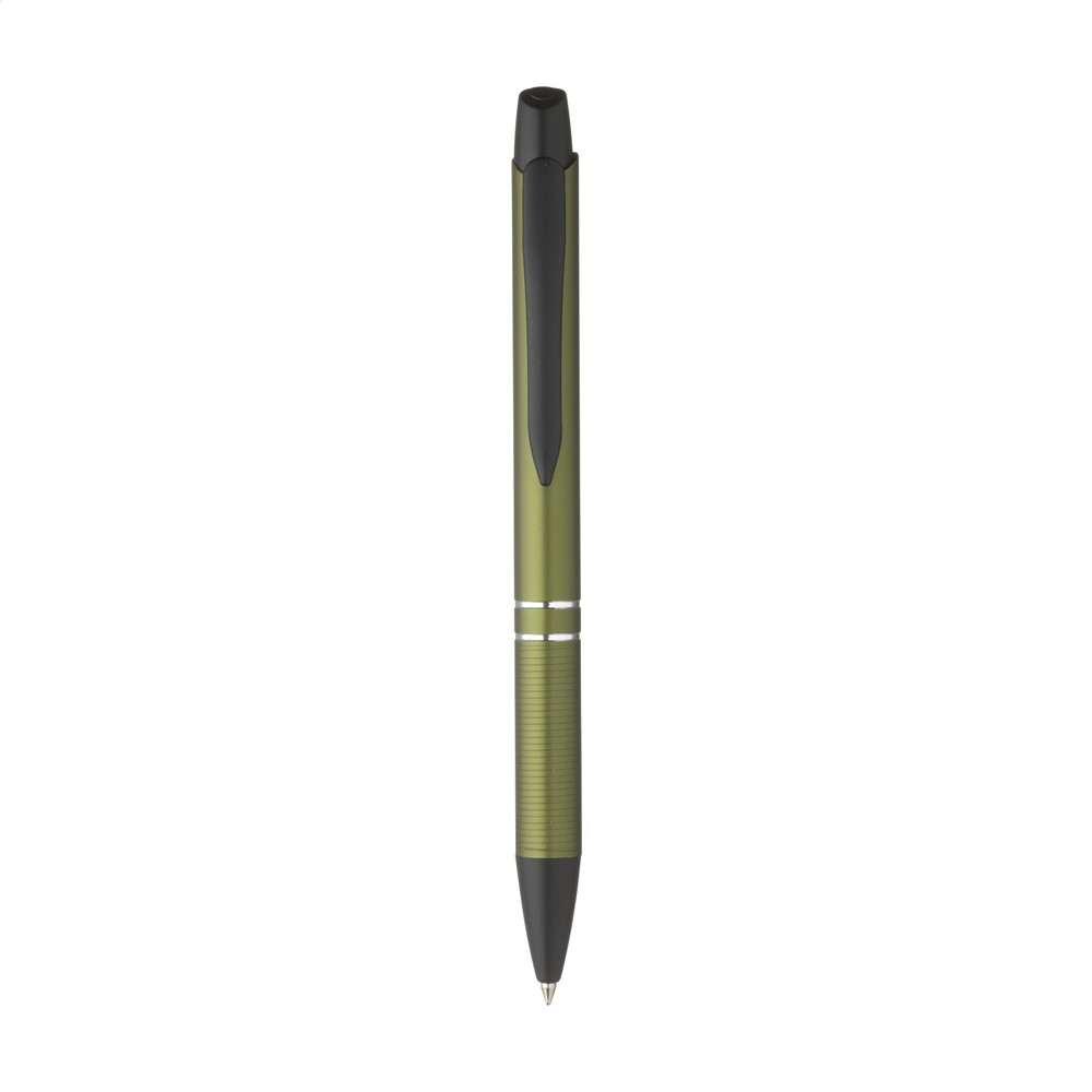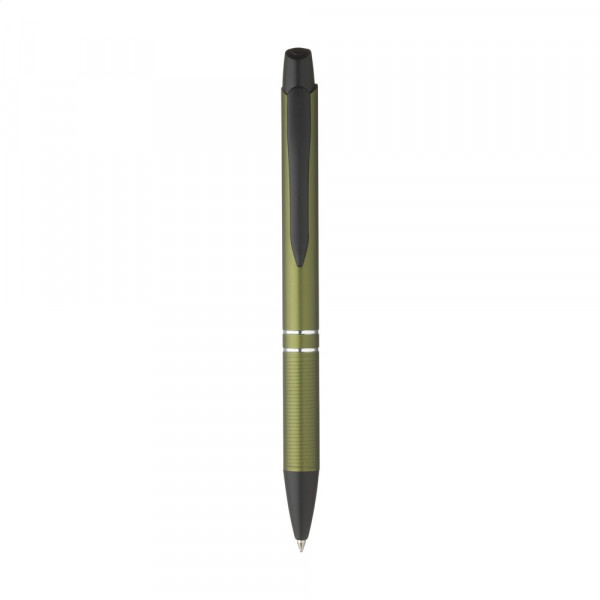 Chique, blauwschrijvende, aluminium balpen met metallic look finish, metalen clip en gripvast voorstuk.
