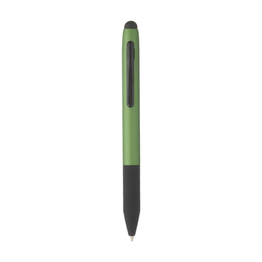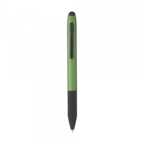 Blauwschrijvende, aluminium balpen in metallic look. Met rubberen top/pointer voor het bedienen van touchscreens, gripvast, rubberen voorstuk, metalen clip en draaikliksysteem. Deze pen is kort van stuk en daarom bijzonder.