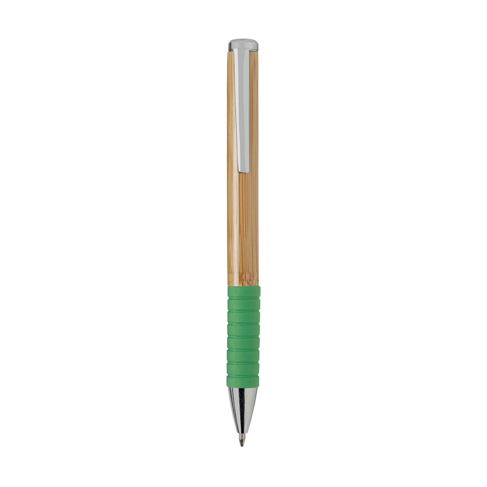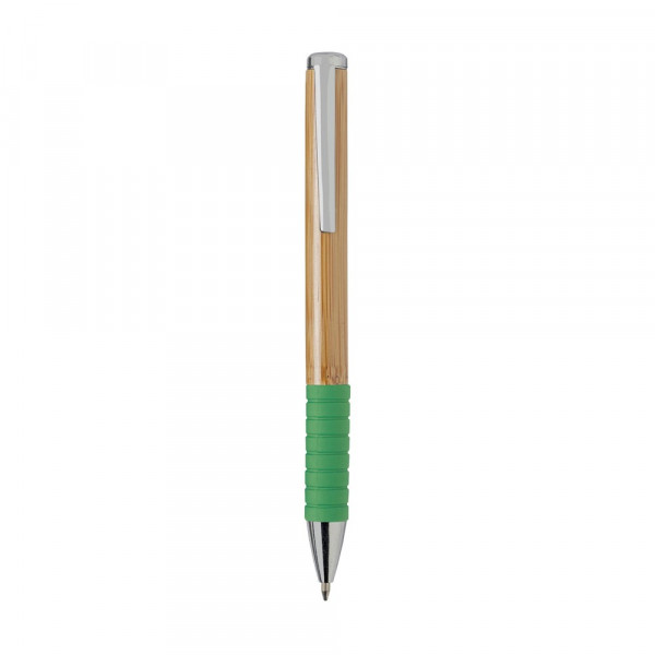 Blauwschrijvende balpen met bamboe houder, metalen clip, draaikliksysteem en gekleurd rubberen, gripvast voorstuk. Geef uw geschenk meer karakter met één van onze stijlvolle geschenkverpakkingen.