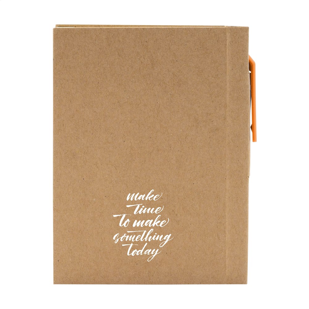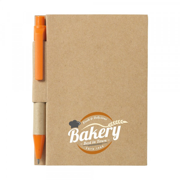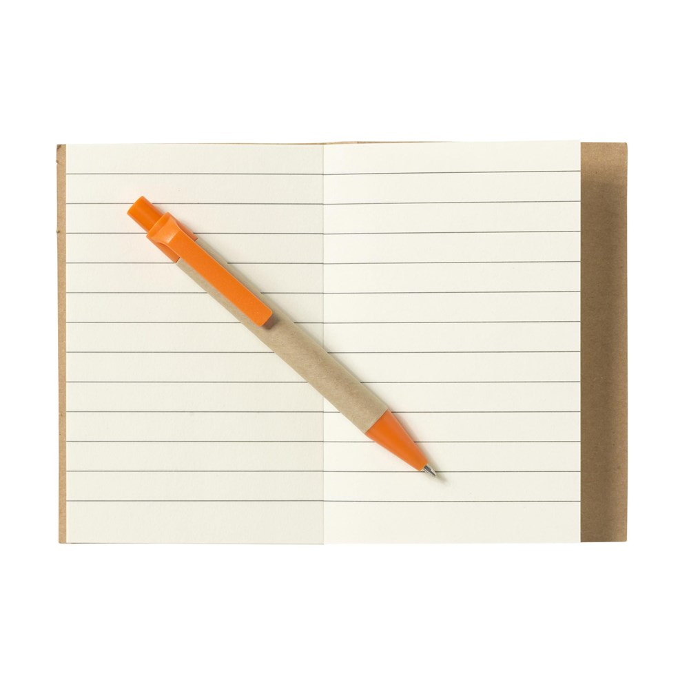 Milieuvriendelijk, mini notitieboekje van gerecycled materiaal, met ca. 80 vel crèmekleurig gelinieerd papier, kartonnen omslag en gebonden rug. Incl. blauwschrijvende balpen.