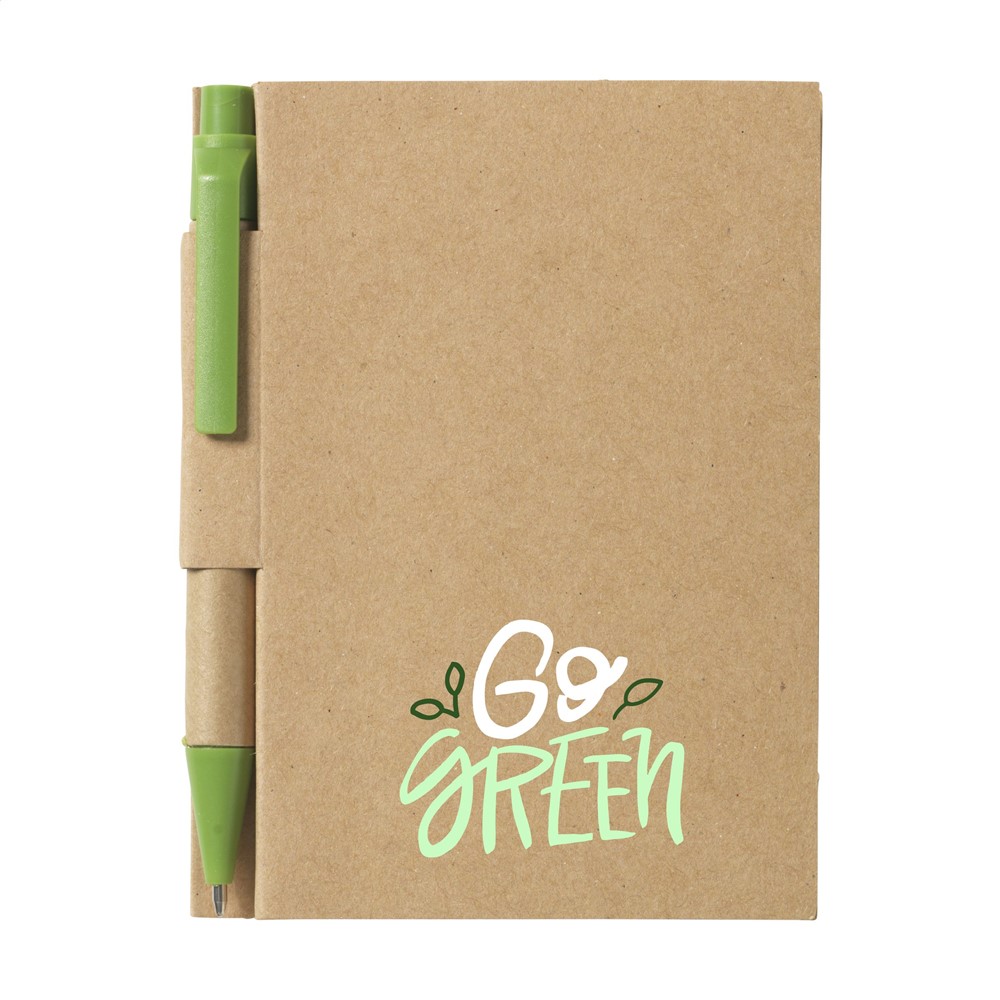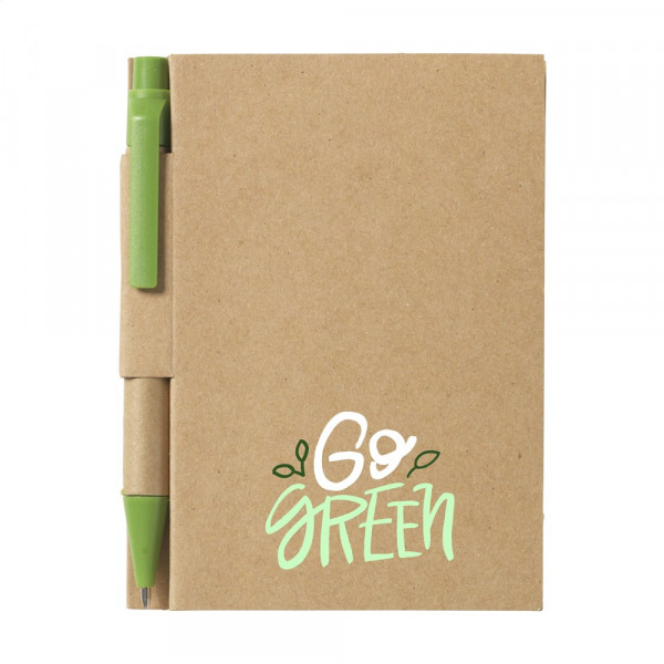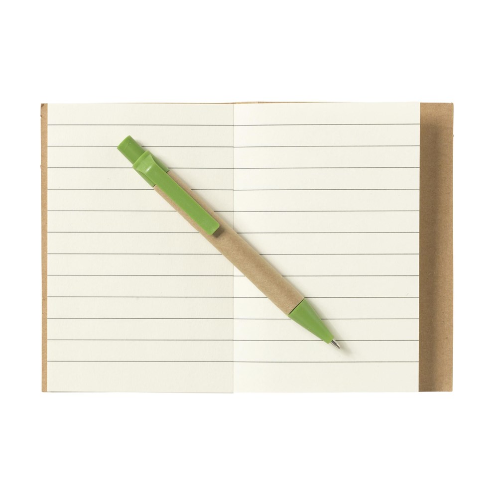 Milieuvriendelijk, mini notitieboekje van gerecycled materiaal, met ca. 80 vel crèmekleurig gelinieerd papier, kartonnen omslag en gebonden rug. Incl. blauwschrijvende balpen.