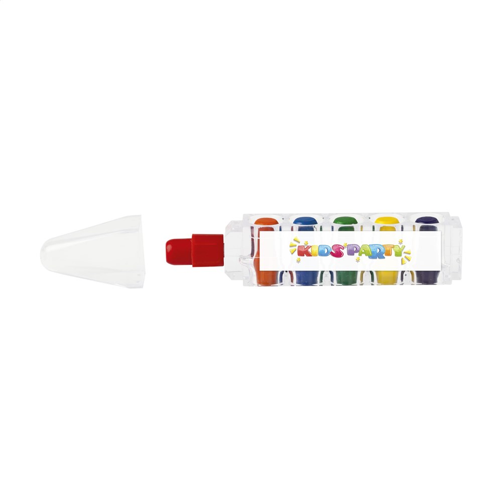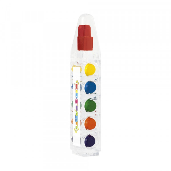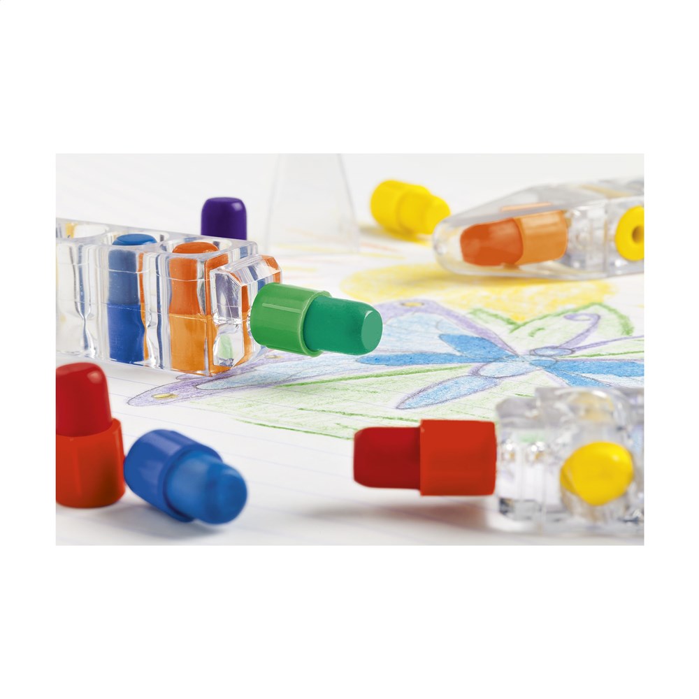 6 waskrijtjes in een transparante houder in de vorm van een pen. Geschikt voor kinderen vanaf 3 jaar.