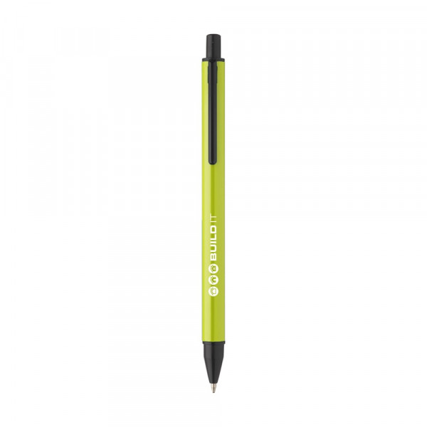 Blauwschrijvende, aluminium balpen met zwartaccenten, metalen klip en strakke vormgeving.