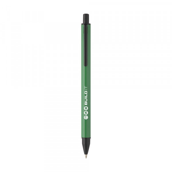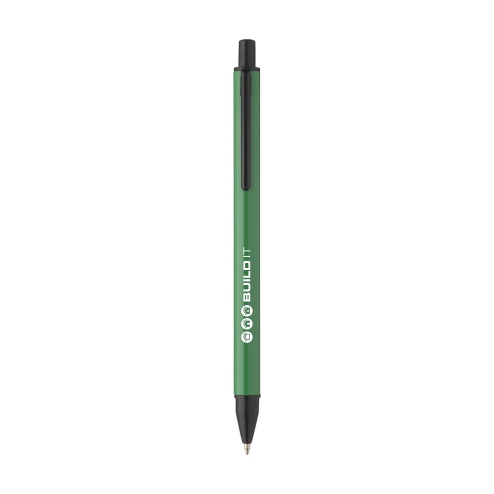 Blauwschrijvende, aluminium balpen met zwartaccenten, metalen klip en strakke vormgeving.