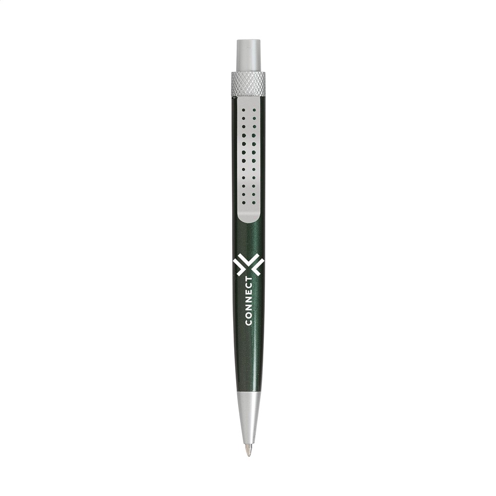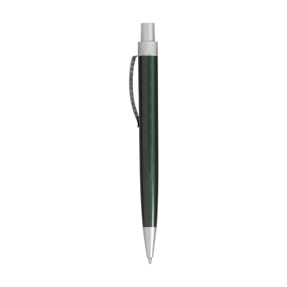 Blauwschrijvende balpen met houder in metallic look en metalen clip.