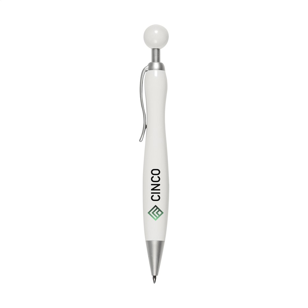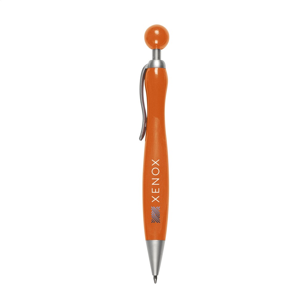 Blauwschrijvende balpen met opvallende drukknop.meer