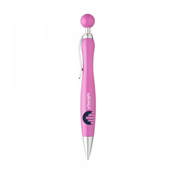 Blauwschrijvende balpen met opvallende drukknop.meer