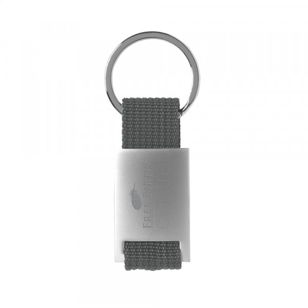Matmetalen sleutelhanger gecombineerd met sterk geweven nylon aan stevige sleutelring. Per stuk in doosje.
