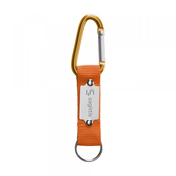 Karabijnhaak gecombineerd met sterk geweven nylon aan stevige sleutelring.