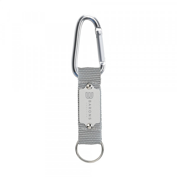 Karabijnhaak gecombineerd met sterk geweven nylon aan stevige sleutelring.