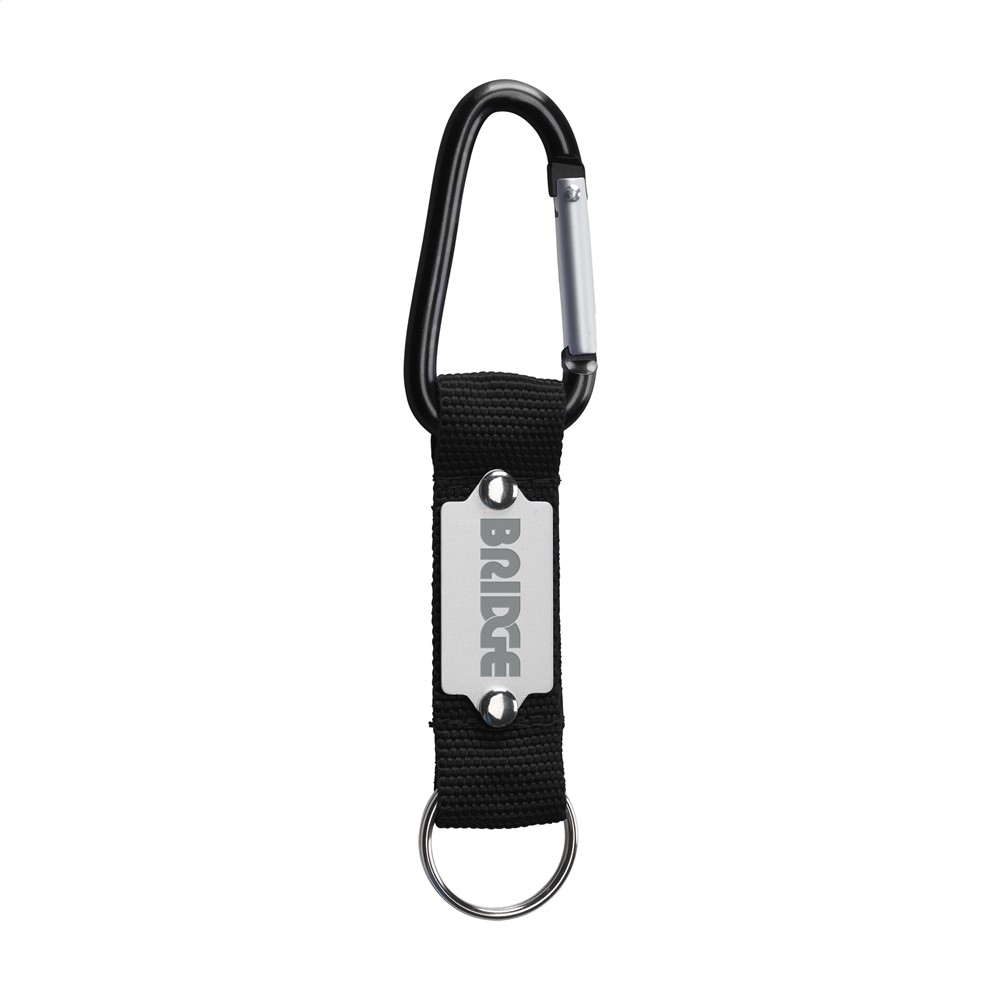 Karabijnhaak gecombineerd met sterk geweven nylon aan stevige sleutelring.