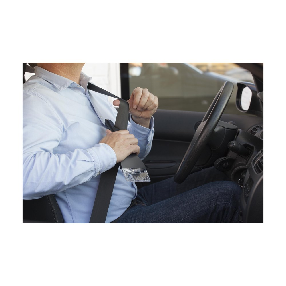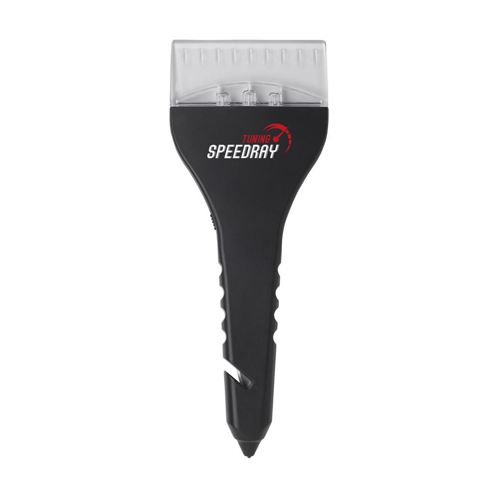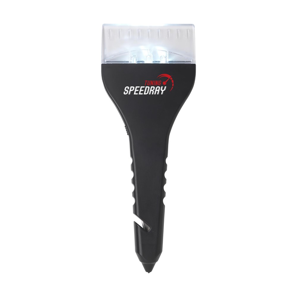 Multifunctionele ijskrabber voorzien van verlichting middels 3 felwitte led-lampjes, een veiligheidshamer en een mes voor het doorsnijden van de autogordel. Incl. celbatterij.