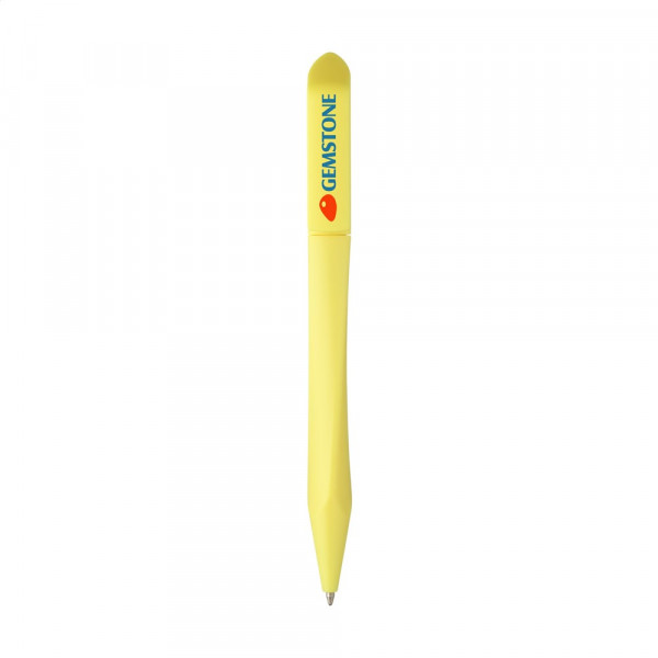Blauwschrijvende balpen met matte houder in opvallende driehoeksvorm met een speelse draai, handig draaikliksysteem en royale clip.