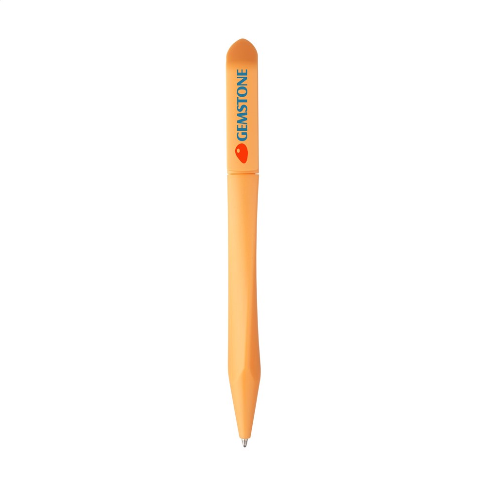 Blauwschrijvende balpen met matte houder in opvallende driehoeksvorm met een speelse draai, handig draaikliksysteem en royale clip.