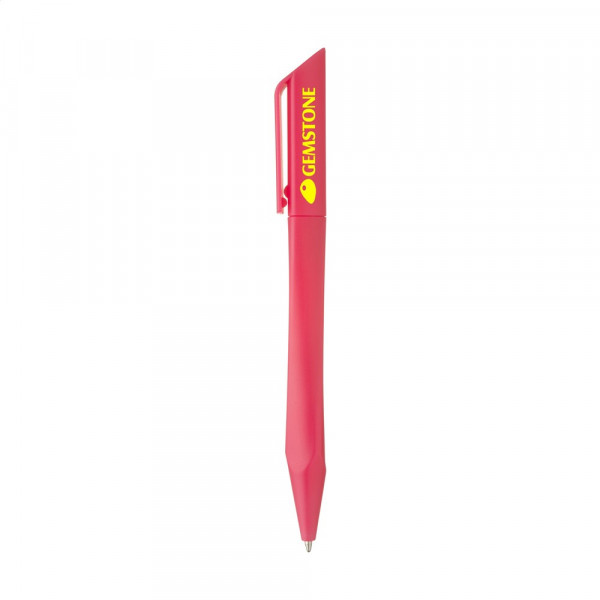 Blauwschrijvende balpen met matte houder in opvallende driehoeksvorm met een speelse draai, handig draaikliksysteem en royale clip.