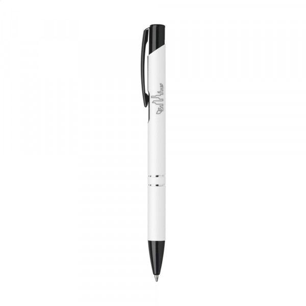 Blauwschrijvende balpen met zwart gelakte drukknop/clip en puntstuk, chrome tussenringen. De houder is afgewerkt met een mooie rubberized finish.