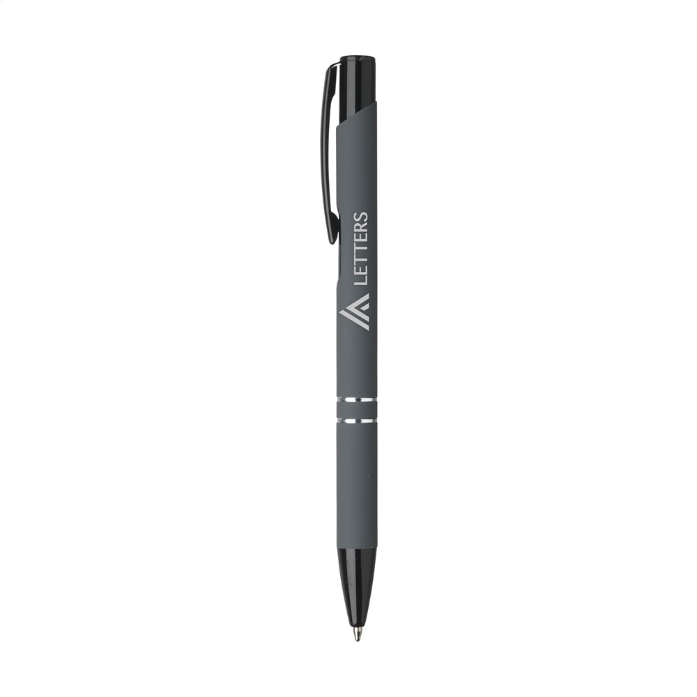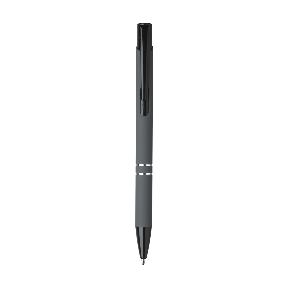 Blauwschrijvende balpen met zwart gelakte drukknop/clip en puntstuk, chrome tussenringen. De houder is afgewerkt met een mooie rubberized finish.