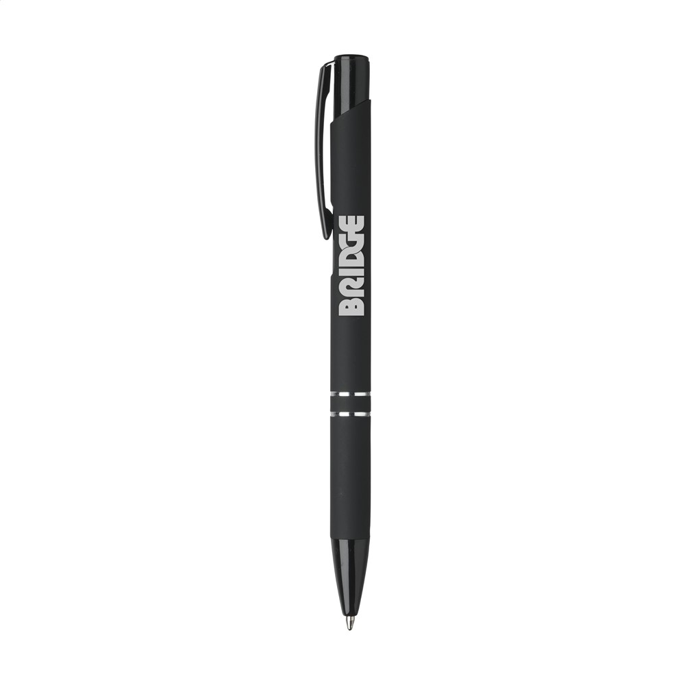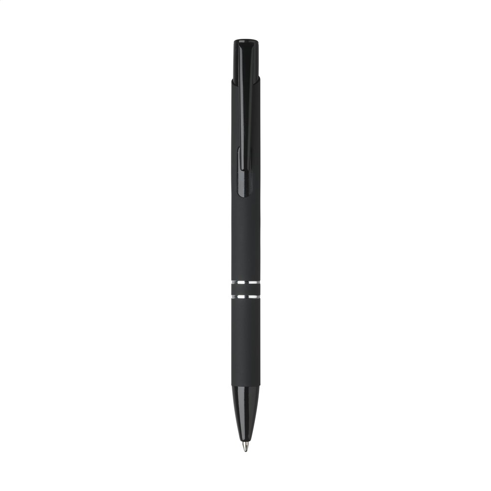 Blauwschrijvende balpen met zwart gelakte drukknop/clip en puntstuk, chrome tussenringen. De houder is afgewerkt met een mooie rubberized finish.