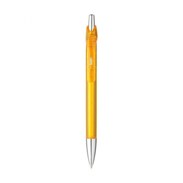 Blauwschrijvende balpen met transparantgekleurde houder en zilverkleurige accenten.meer