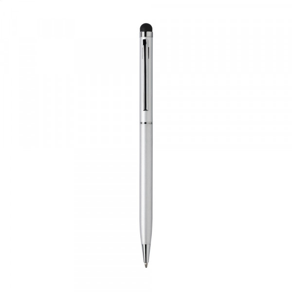 Blauwschrijvende, metalen balpen met rubberen top/pointer voor het bedienen van touchscreens (zoals iPhone/iPad), hoogglans accenten en draaikliksysteem. Geef uw geschenk meer karakter met één van onze stijlvolle geschenkverpakkingen.