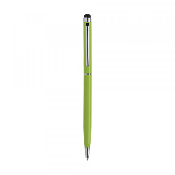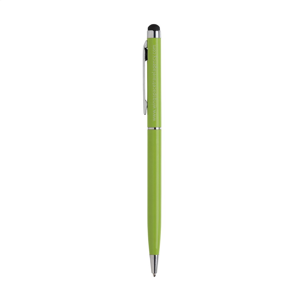 Blauwschrijvende, metalen balpen met rubberen top/pointer voor het bedienen van touchscreens (zoals iPhone/iPad), hoogglans accenten en draaikliksysteem. Geef uw geschenk meer karakter met één van onze stijlvolle geschenkverpakkingen.