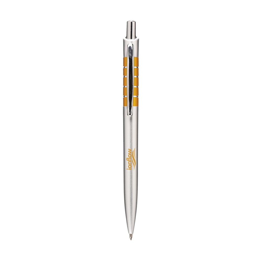 Blauwschrijvende balpen met metallic look ringen en hoogglans accenten.