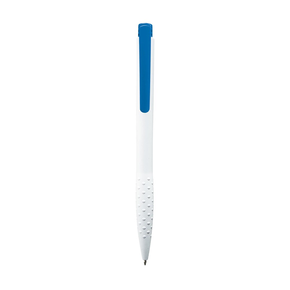 Blauwschrijvende óf zwartschrijvende balpen met gripvast voorstuk, gekleurde clip en drukknop. Geef bij je bestelling a.u.b. jouw voorkeur aan.