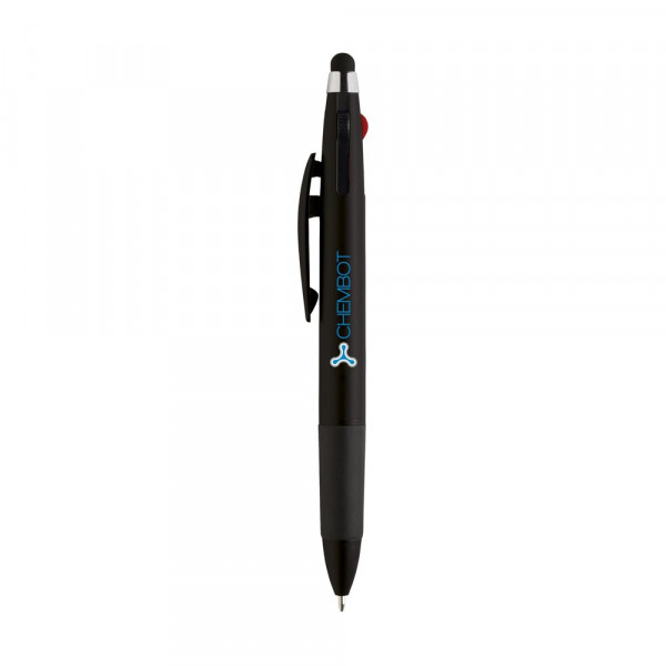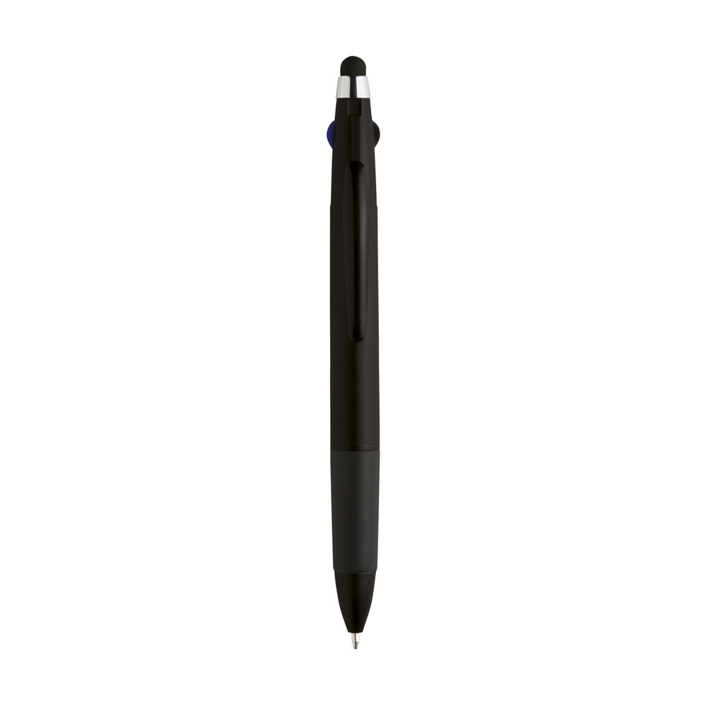 3-kleuren balpen met rubberen top/pointer voor het bedienen van touchscreens (zoals iPhone/iPad), metallic look houder, zilverkleurig accent en rubberen voorstuk. Voorzien van een blauwe, rode en zwarte vulling.