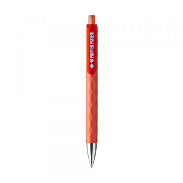 Blauwschrijvende pen met transparante clip en drukknop. De solid houder heeft een opvallend 3D grafisch diamantpatroon.