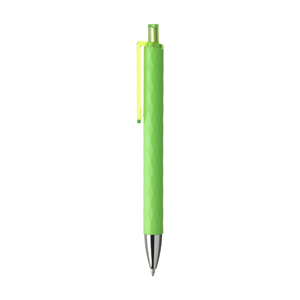 Blauwschrijvende pen met transparante clip en drukknop. De solid houder heeft een opvallend 3D grafisch diamantpatroon.