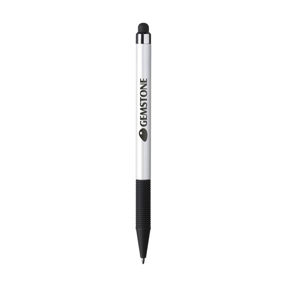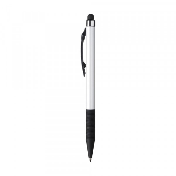 Blauwschrijvende, lichtgewicht balpen met top/pointer voor het bedienen van touchscreens (zoals Iphone/Ipad). Slanke houder in metallic look met clip, tevens aan-/uitknop en gripvast, rubberen voorstuk.