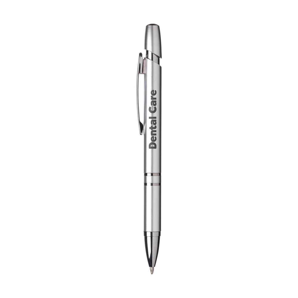 Blauwschrijvende balpen met metallic look houder, metalen clip en tussenringen.meer