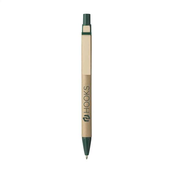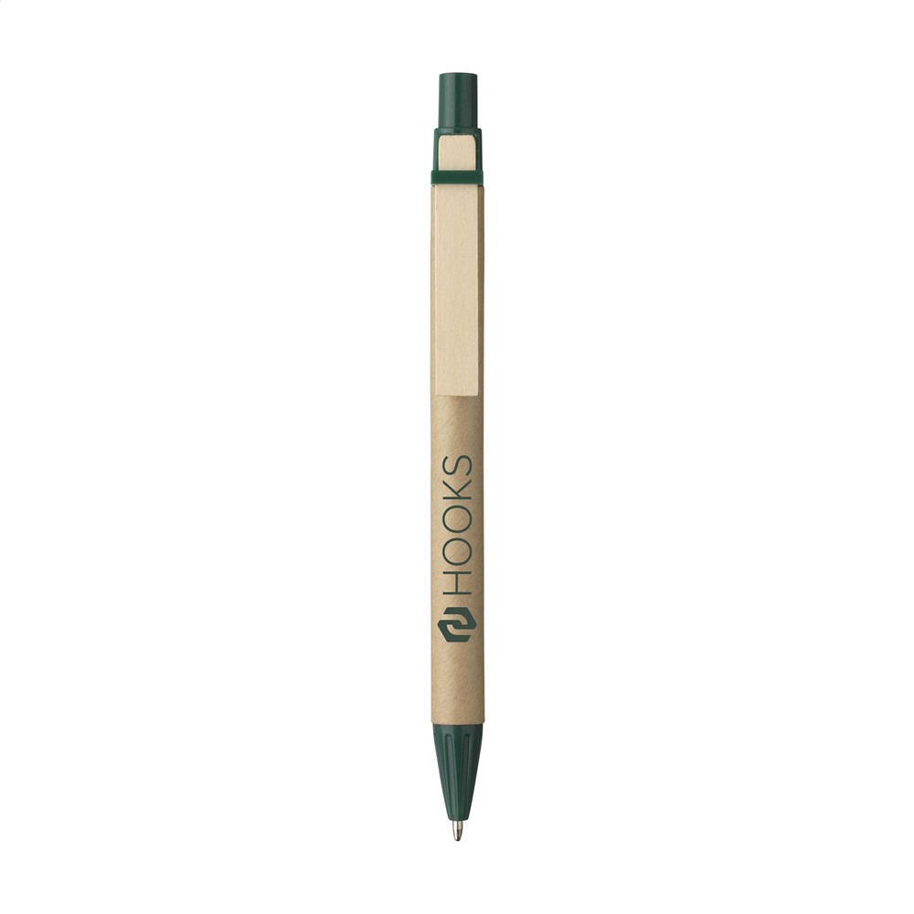 Blauwschrijvende balpen met houder van gerecycled karton, houten clip en gekleurde kunststof accenten.