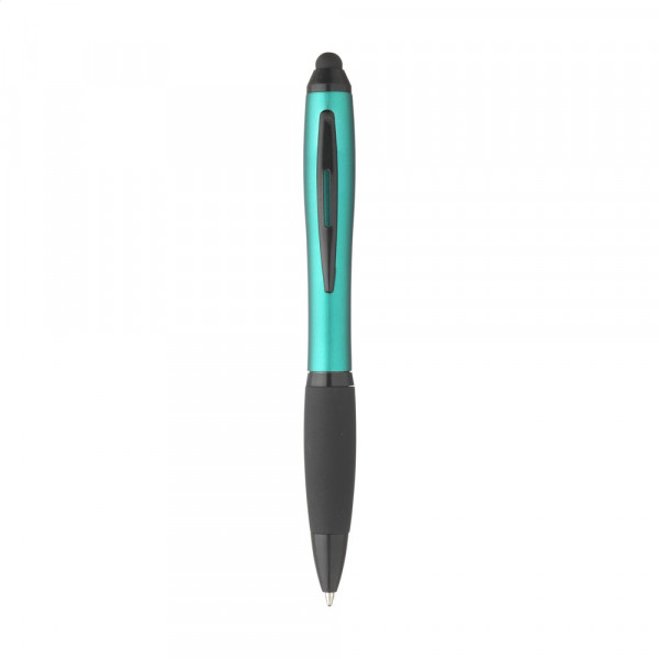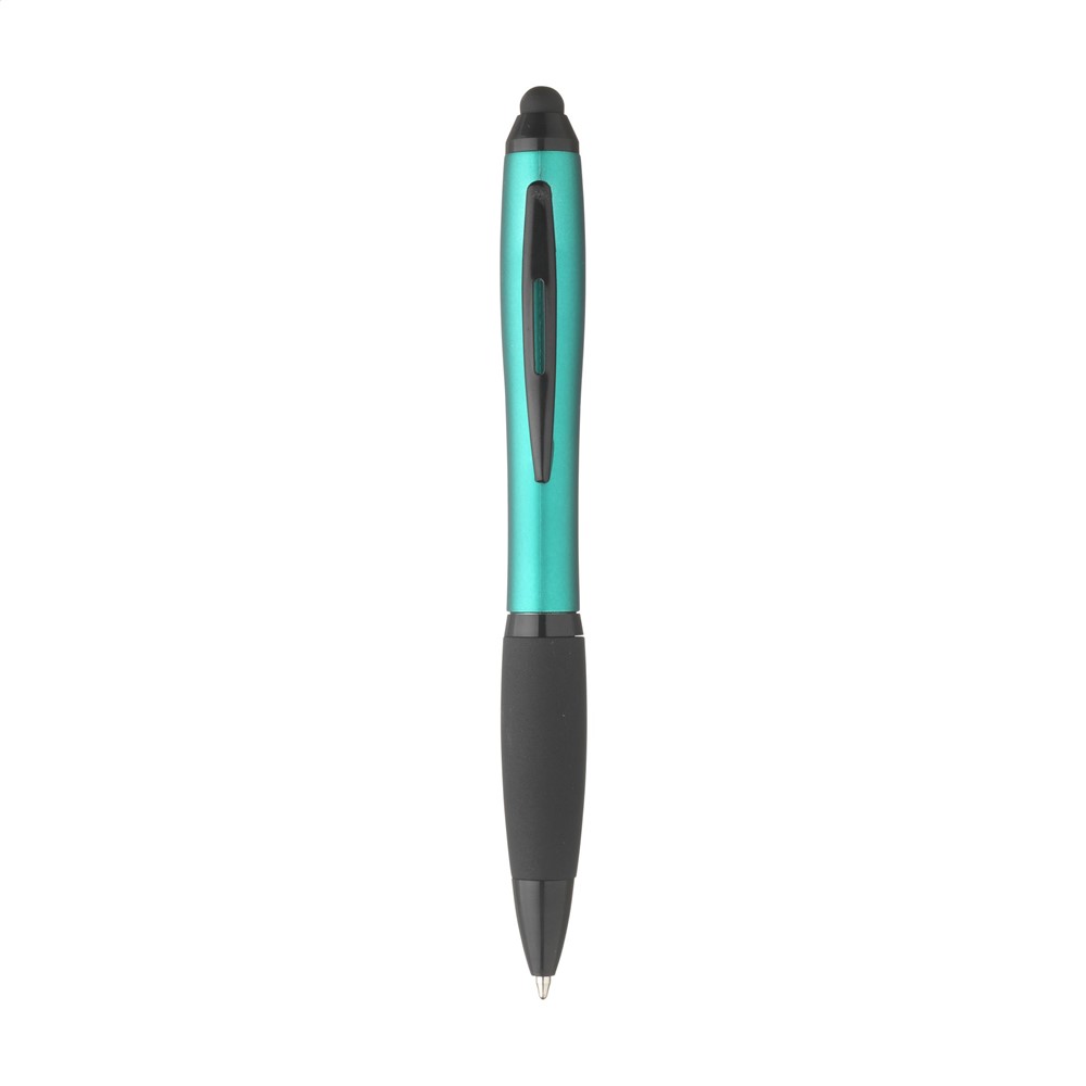 Blauwschrijvende balpen met houder in metallic look, gripvast, rubberen voorstuk, metalen clip en rubberen top/pointer voor het bedienen van touchscreens.