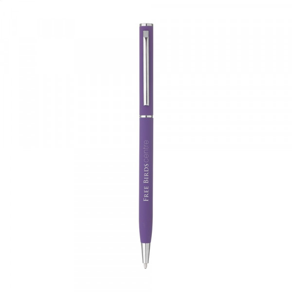 Elegante, blauwschrijvende, aluminium balpen met superslanke houder met rubberized finish, draaikliksysteem en metalen clip, puntstuk, tussenring en top.