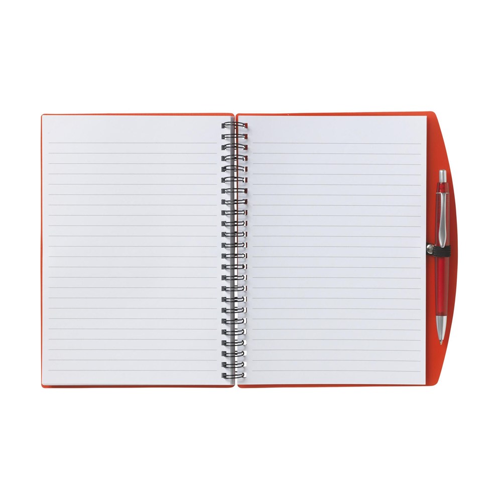 Notitieboek met ca. 70 vel gelinieerd schrijfpapier en transparant kunststof omslag, gebonden in metalen wire-o-binding. Incl. blauwschrijvende balpen.