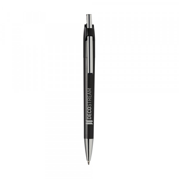 Blauwschrijvende balpen met een stijlvolle, metalen clip, tevens drukknop.meer