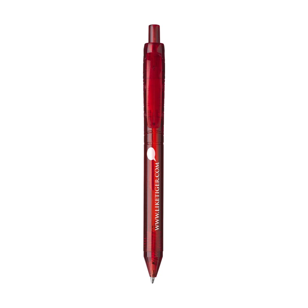 Blauwschrijvende balpen, vrijwel geheel vervaardigd uit gerecyclede PET-flessen.meer