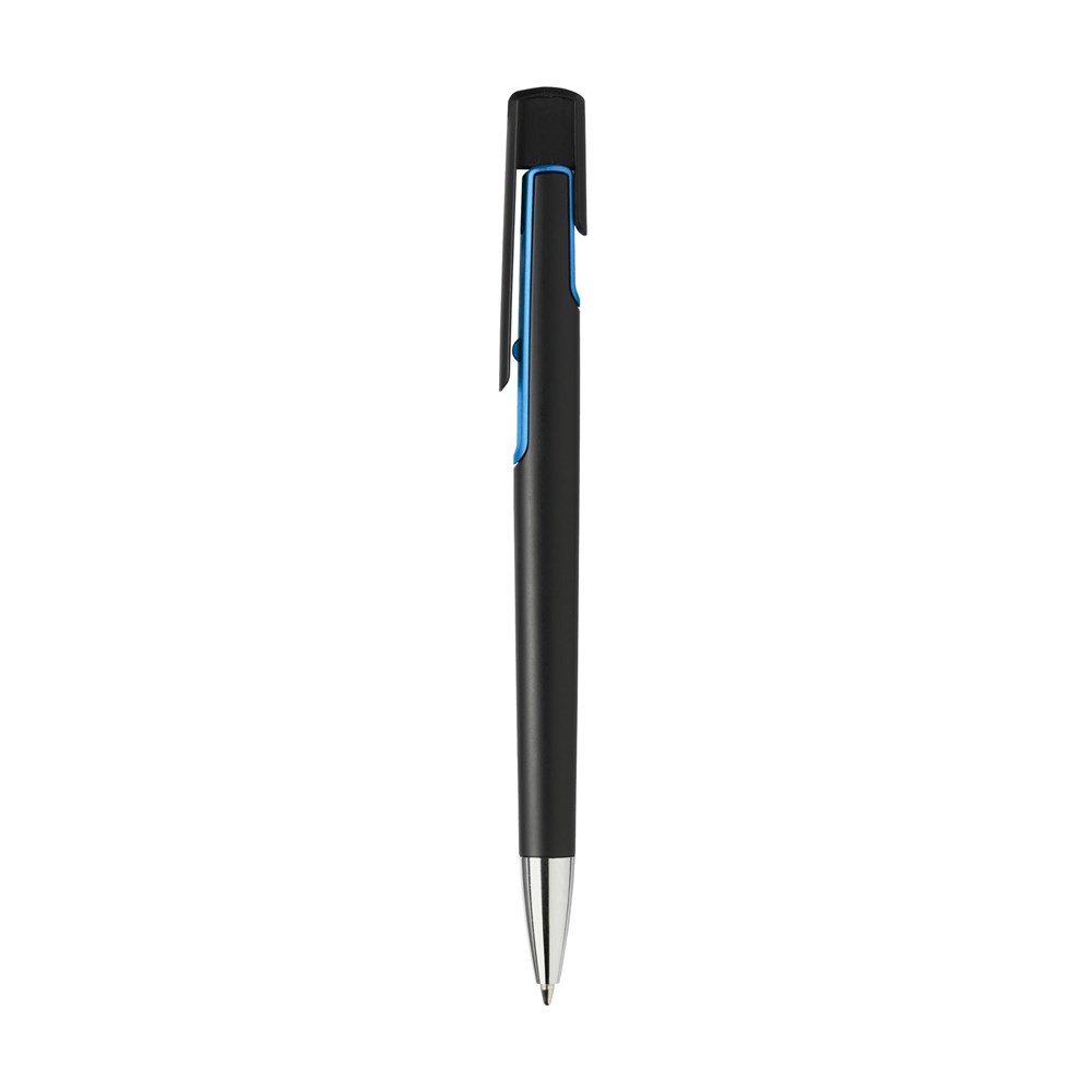 Blauwschrijvende balpen met matzwarte houder, opvallend vormgegeven clip en metallic look kleuraccent.