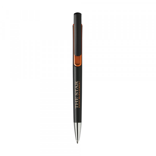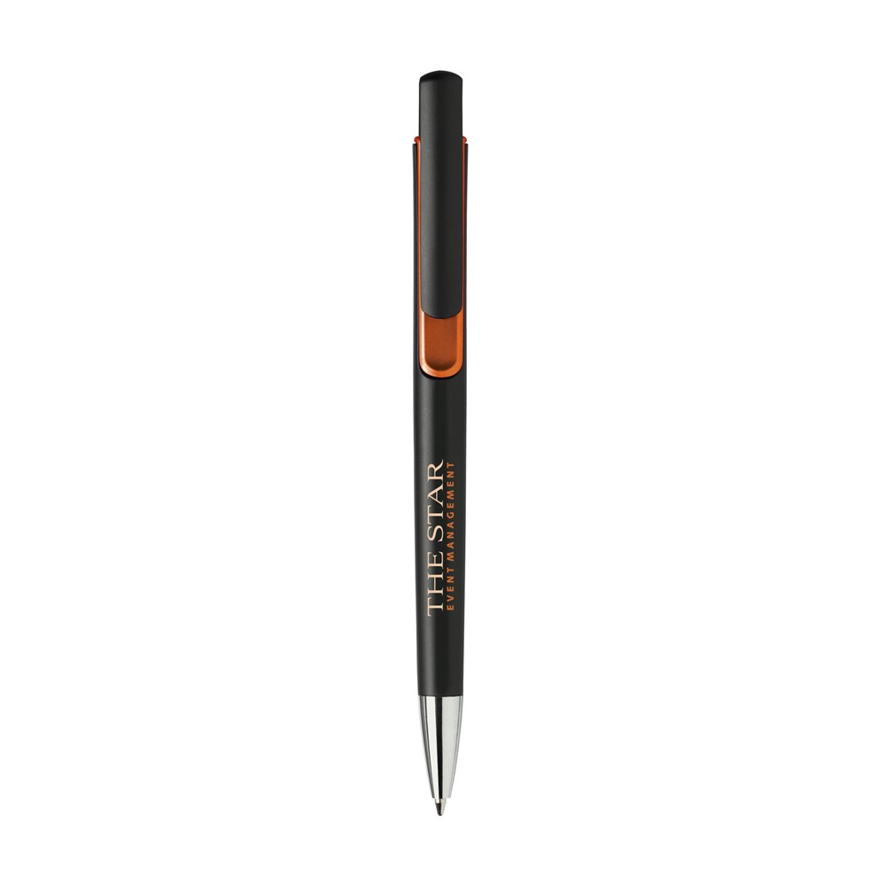 Blauwschrijvende balpen met matzwarte houder, opvallend vormgegeven clip en metallic look kleuraccent.