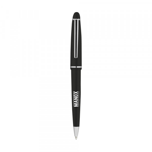 Blauwschrijvende balpen met gepolijste houder, verchroomde, sierlijke clip en puntstuk en schuifkapdruksysteem.