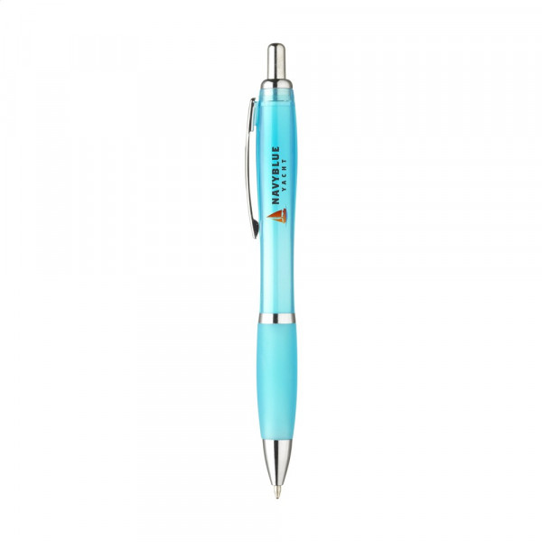 Blauwschrijvende óf zwartschrijvende balpen met transparantgekleurde houder, gripvast voorstuk en metalen clip.