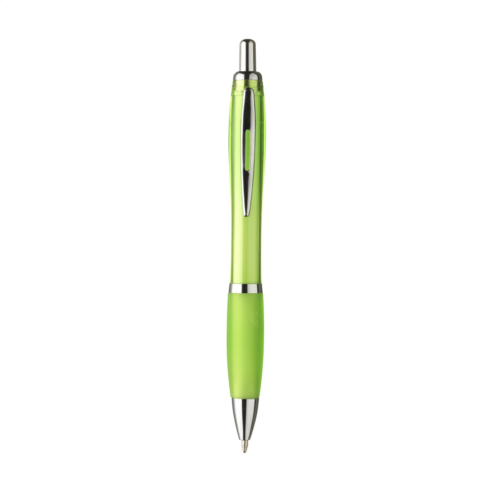 Blauwschrijvende óf zwartschrijvende balpen met transparantgekleurde houder, gripvast voorstuk en metalen clip.