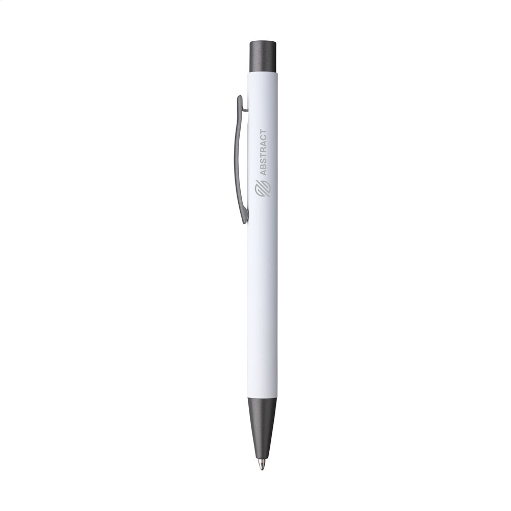 Blauwschrijvende, aluminium balpen met rubberized soft touch finish, stevige metalen clip en...meer